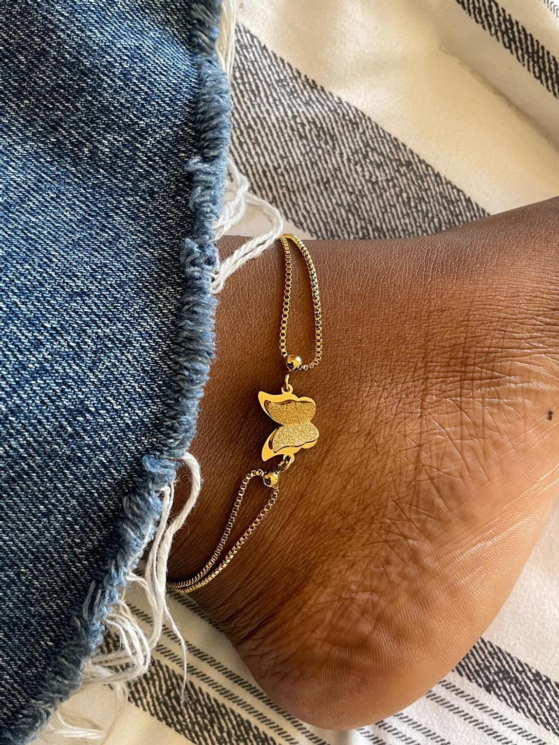 This enchanting layered anklet features a beautiful, textured butterfly charm centered between two fine chains. The subtle sparkle of the charm adds a whimsical, sophisticated focal point to your foot.