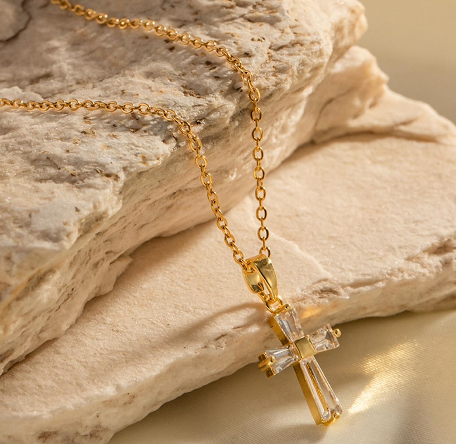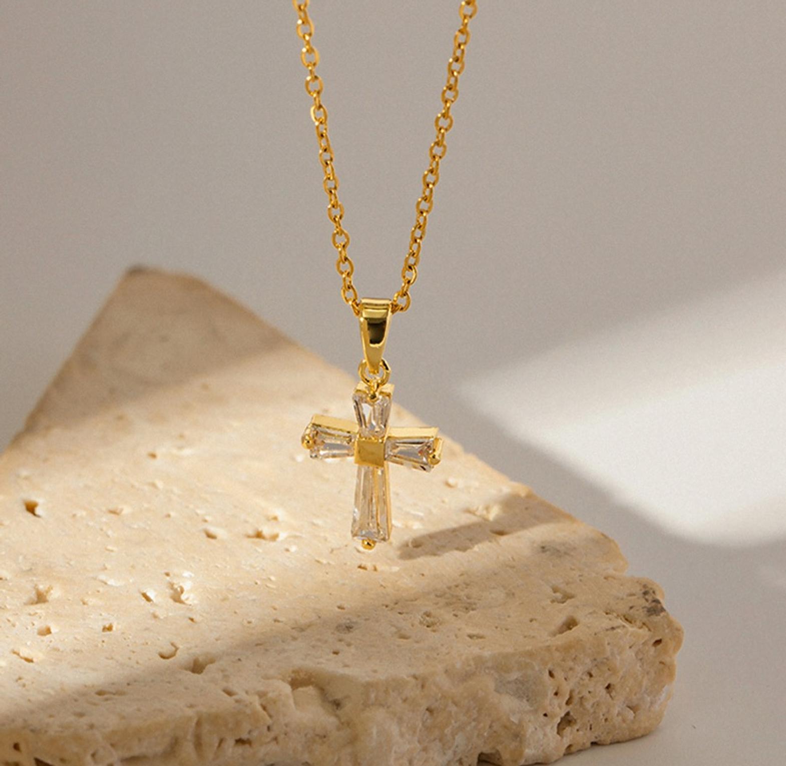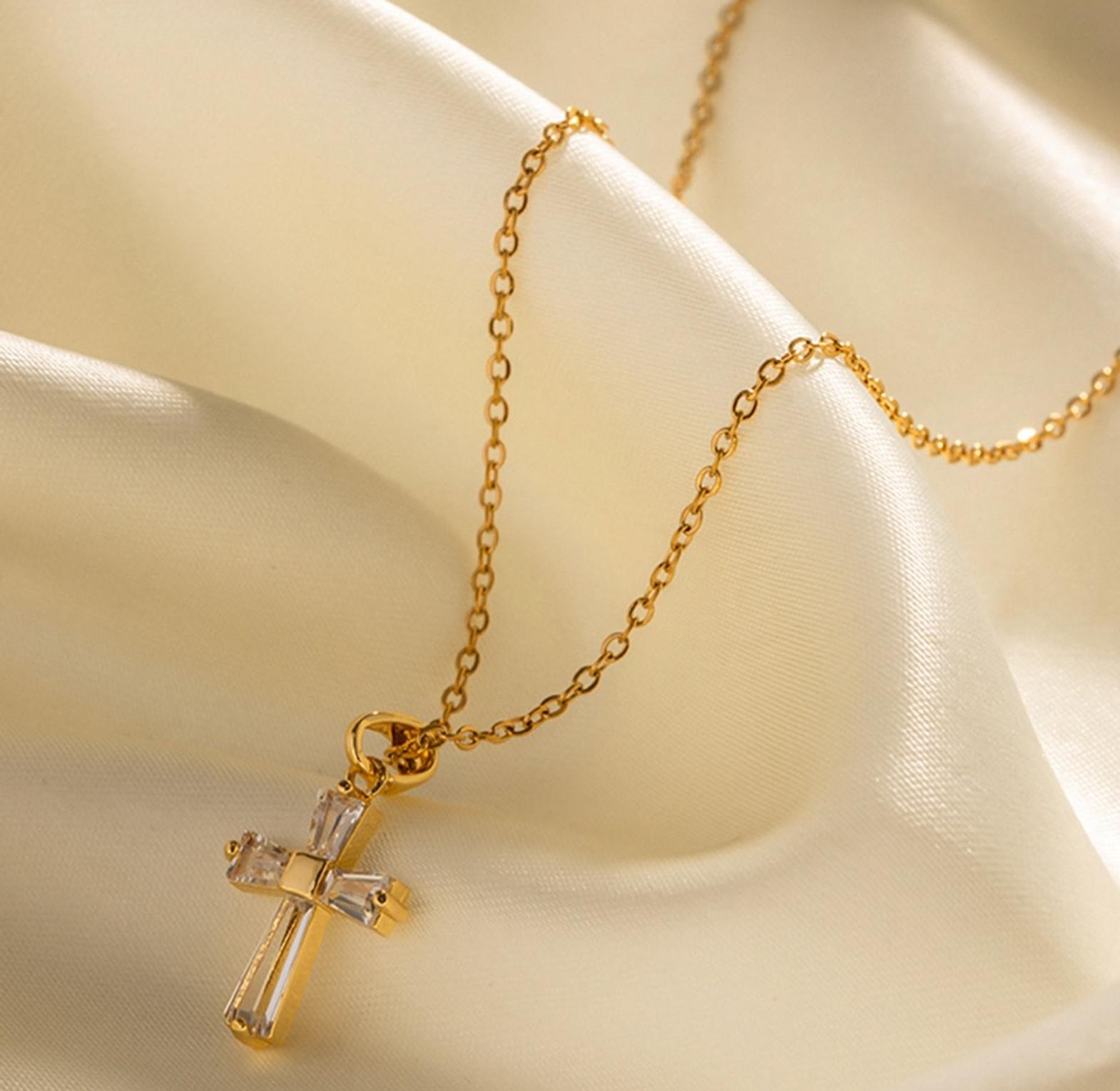An elegant gold cross pendant adorned with sparkling rhinestones, perfect for adding a subtle touch of shine to any outfit.