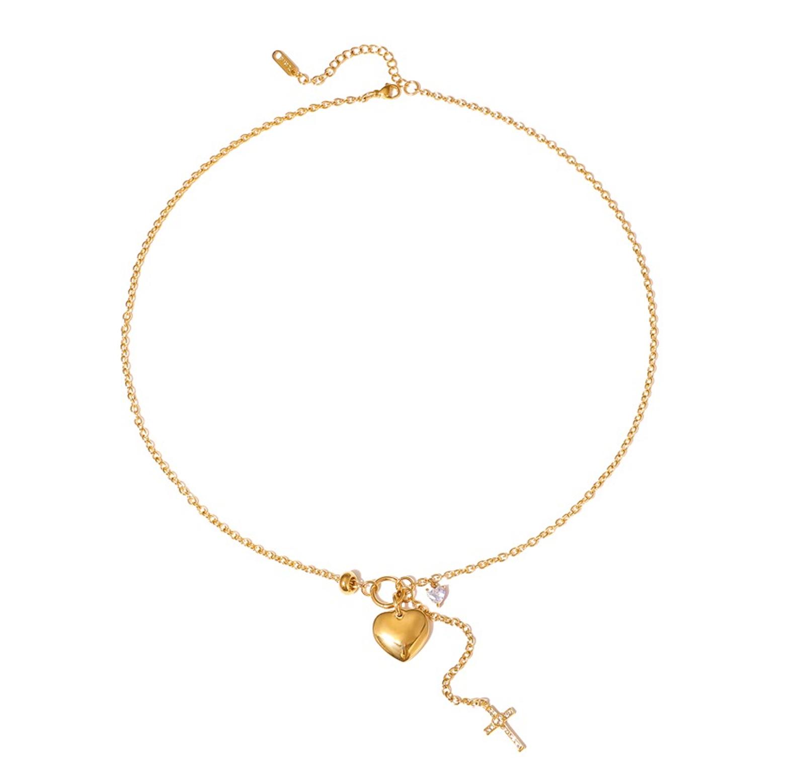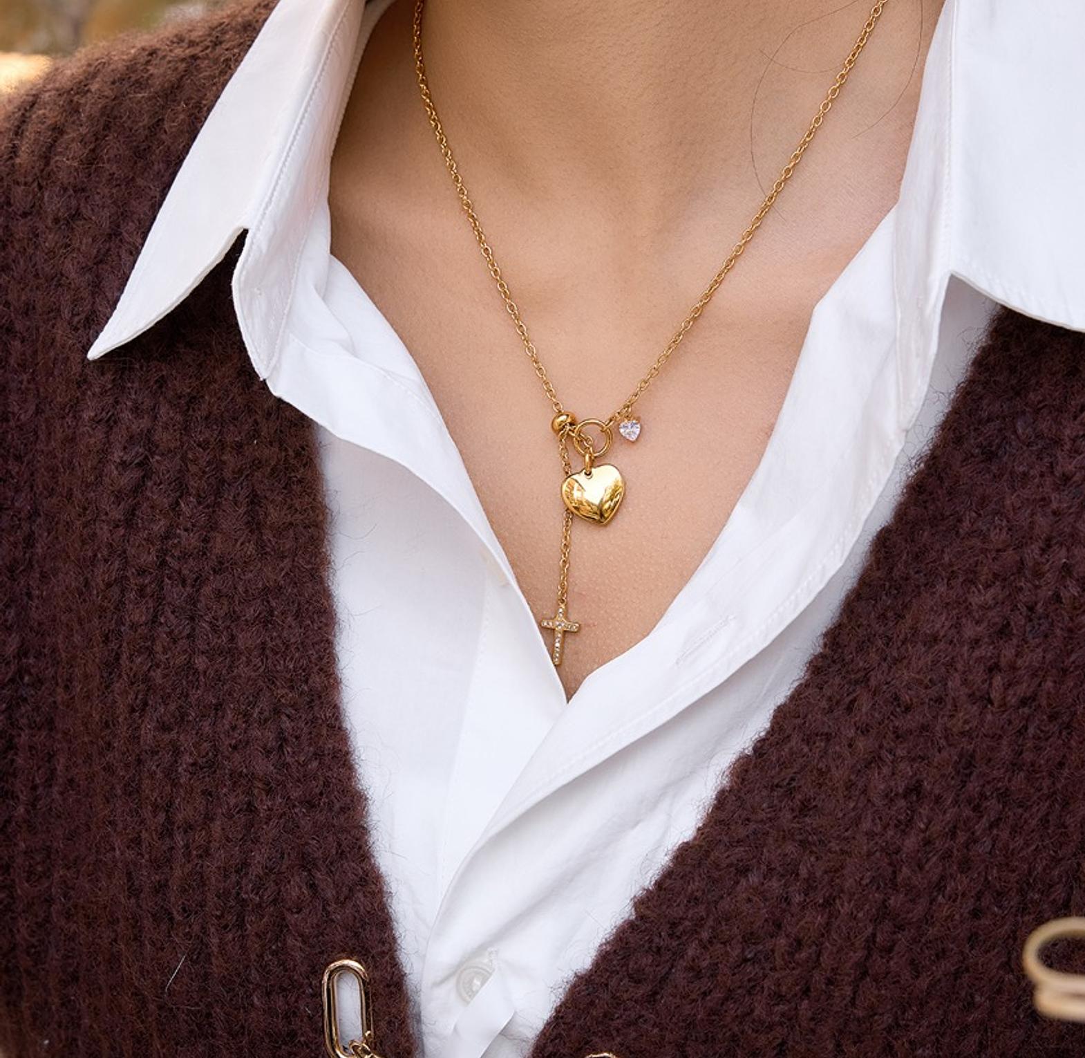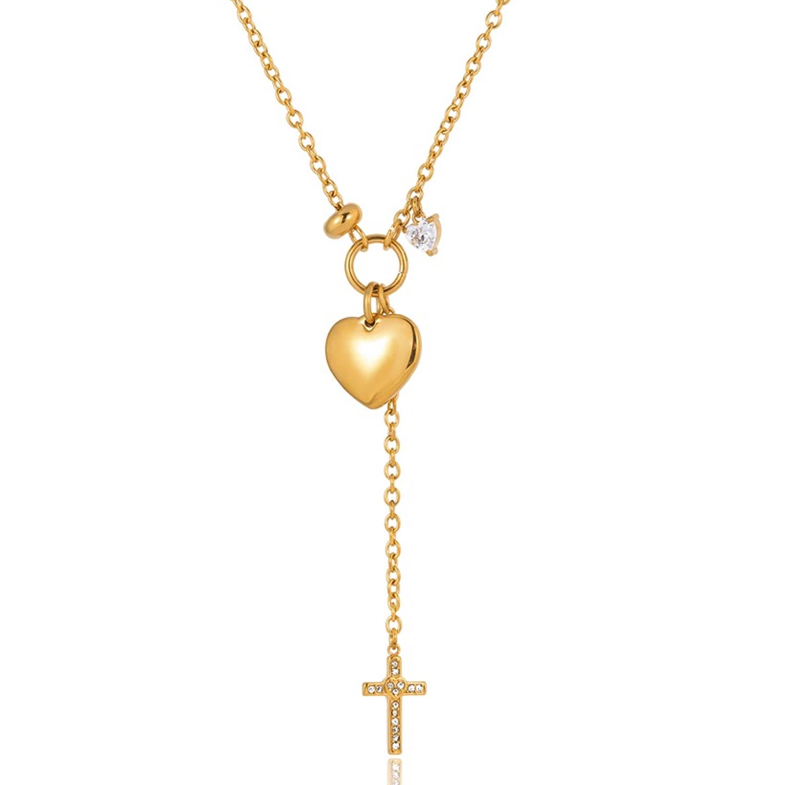 A timeless gold necklace featuring a heart, pearl, and cross — a symbol of love and faith.