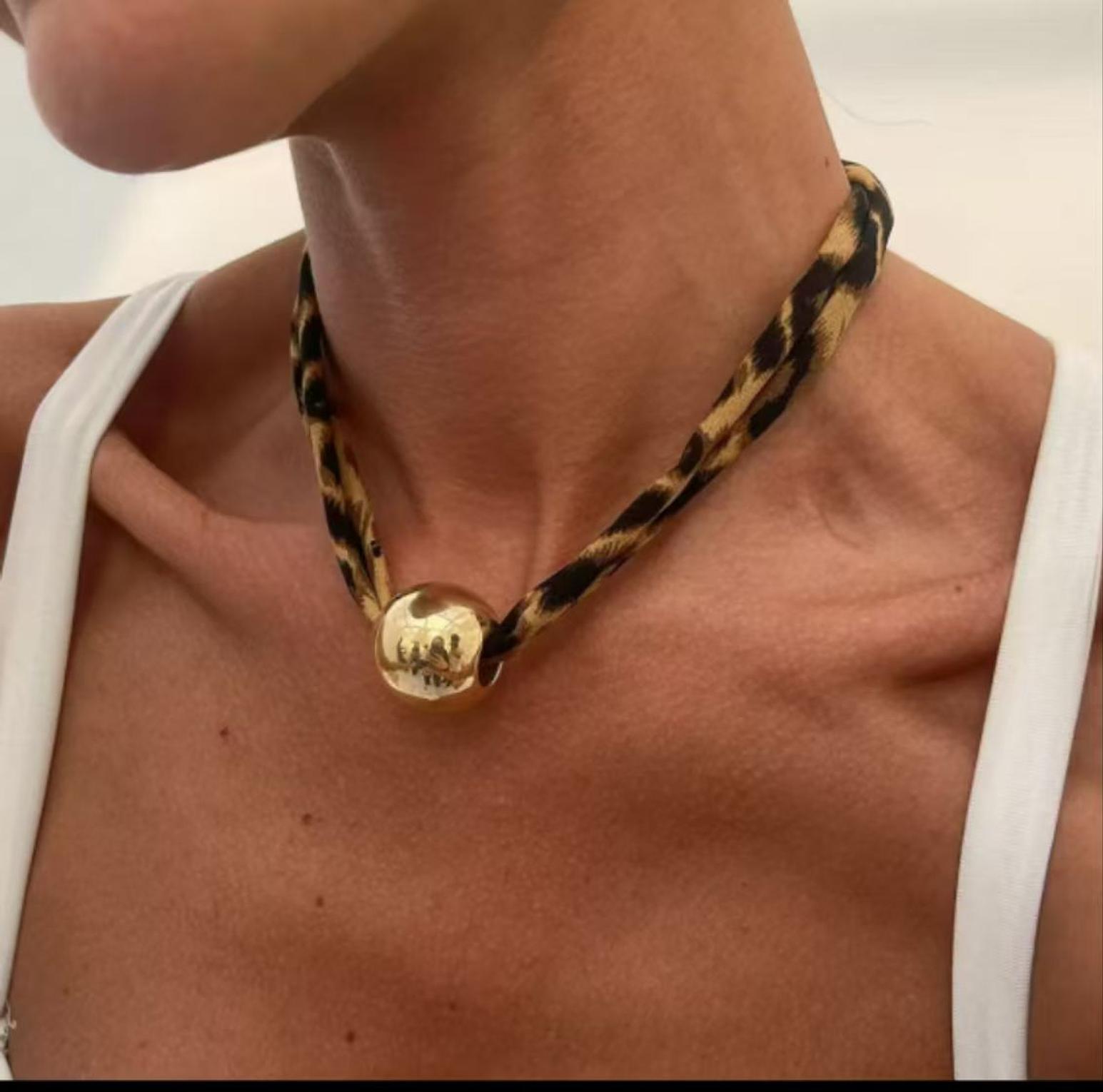 A sleek gold-toned circular pendant featuring a distinctive hammered texture that creates beautiful light reflection, suspended from a bold leopard print fabric chain. This minimalist yet striking piece combines modern sophistication with wild fashion flair for effortless everyday elegance.