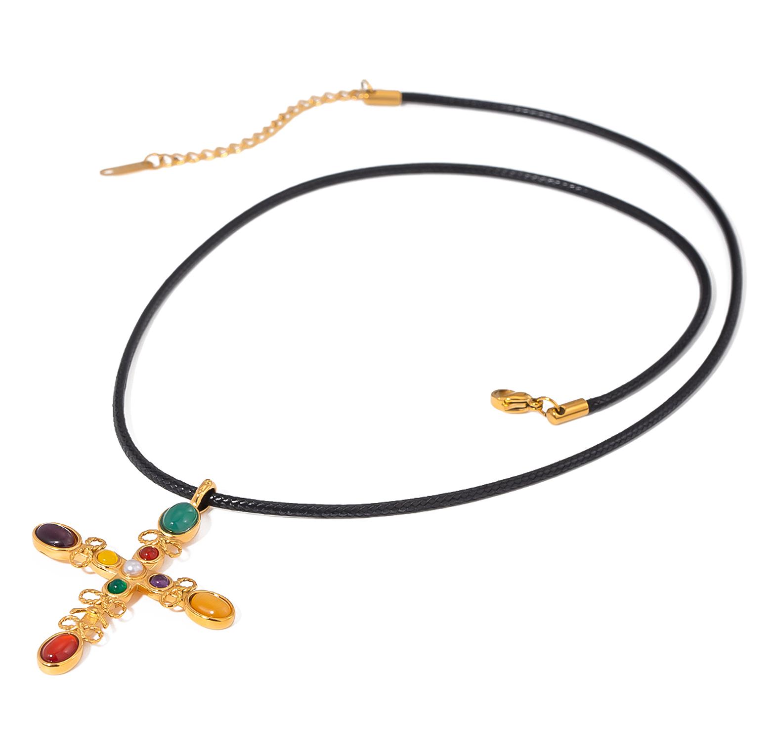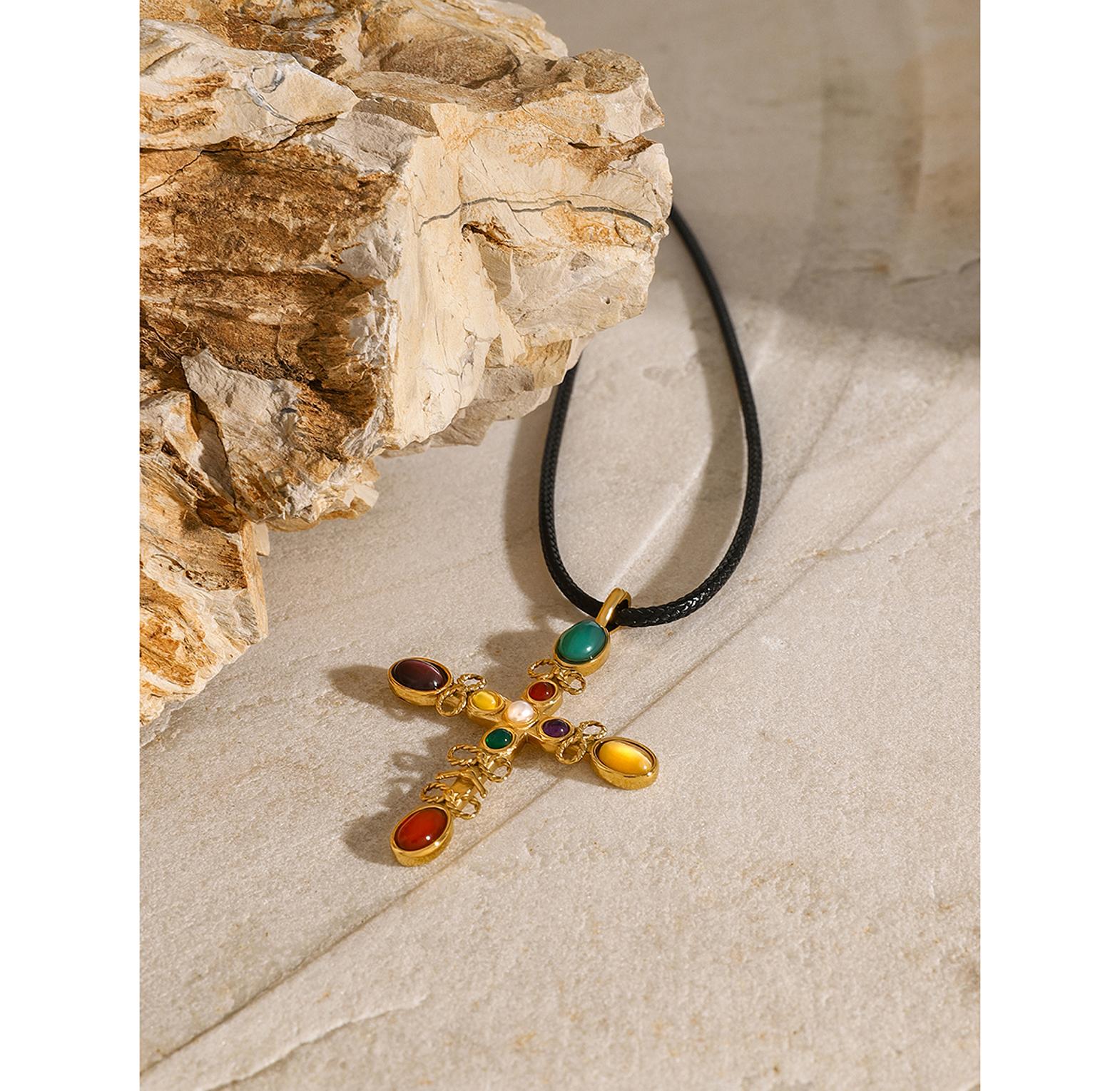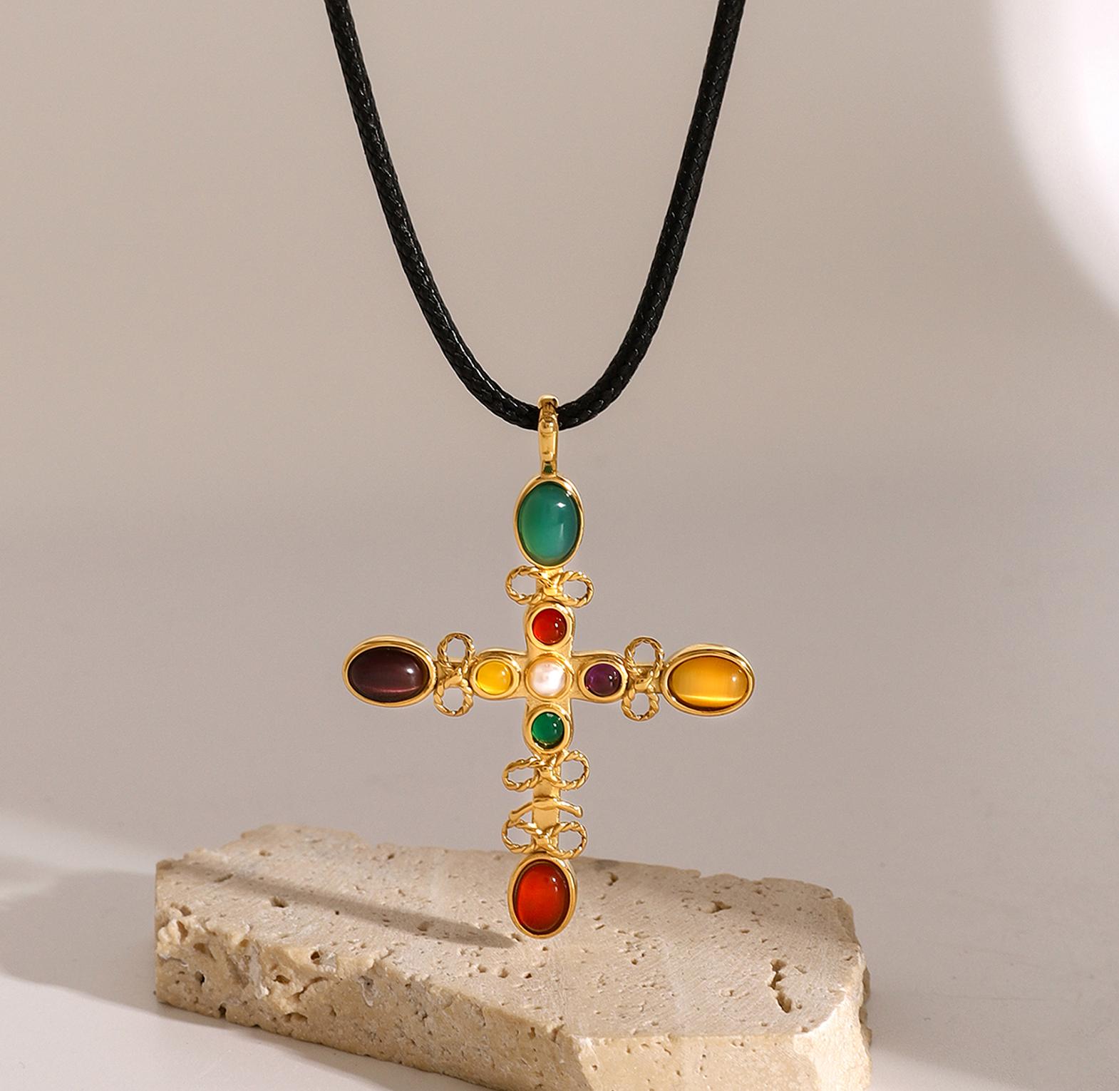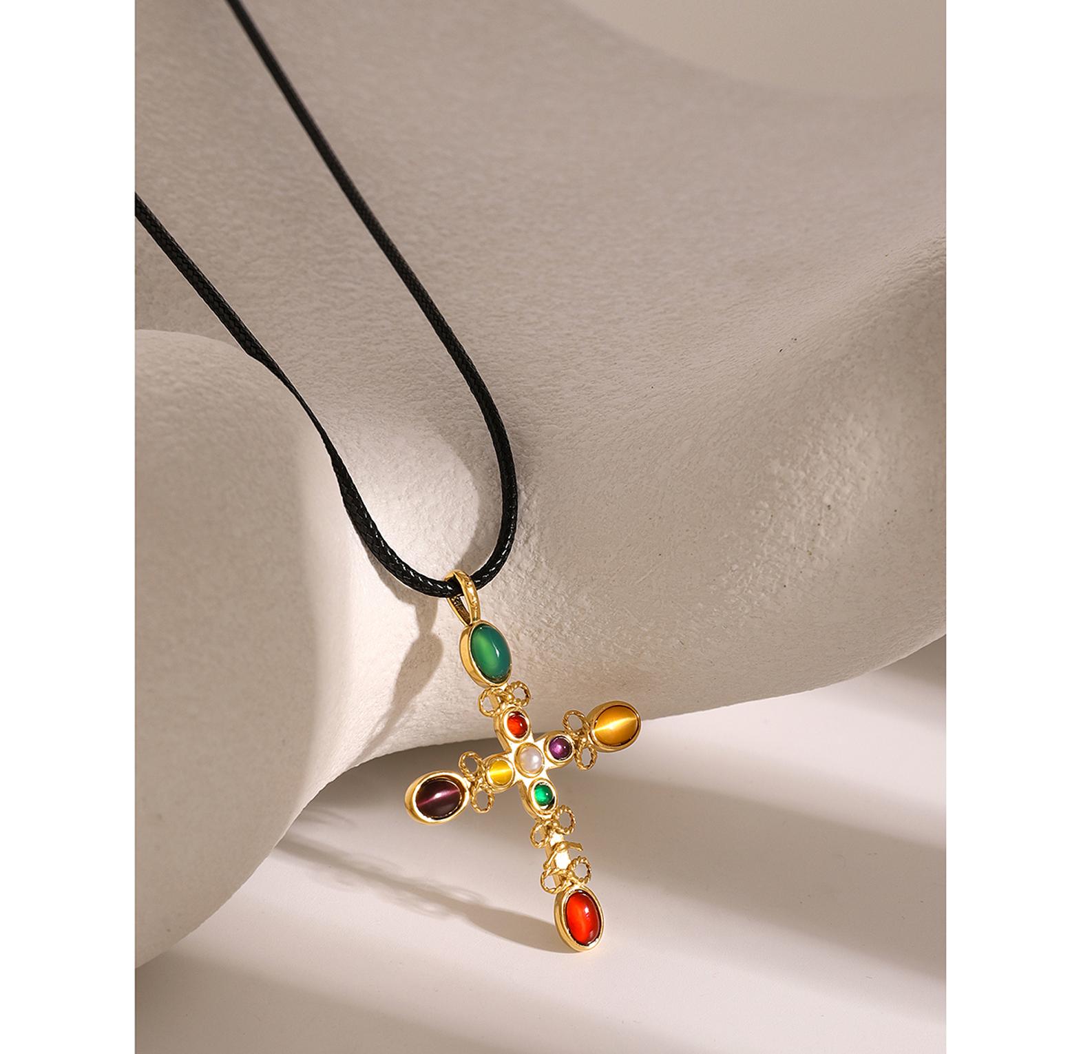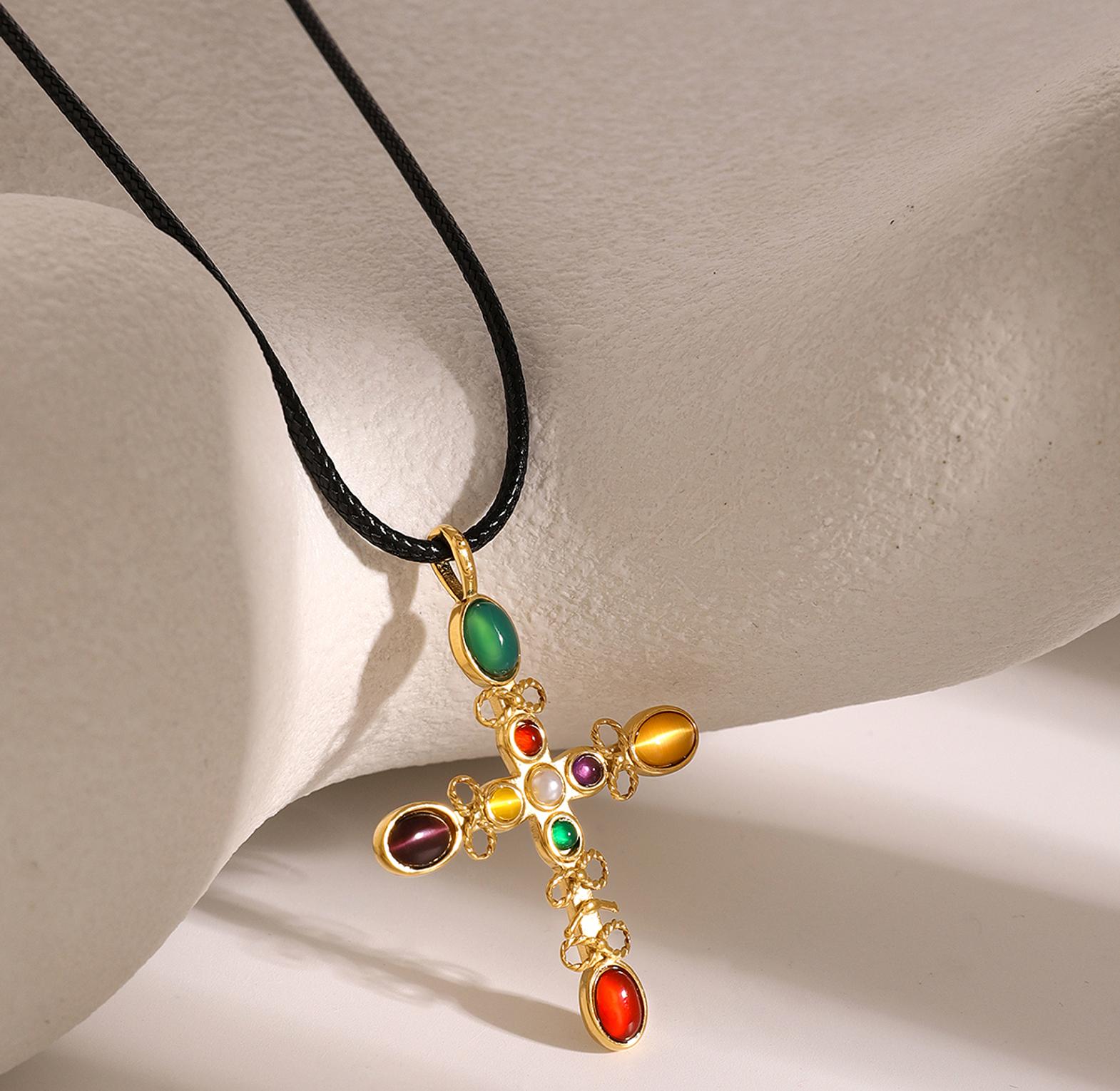 A radiant gold-toned necklace featuring a glowing cat’s eye stone cross for timeless elegance.