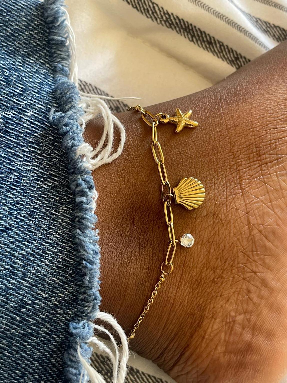 Dive into effortless style with this charming anklet featuring a mix of chains adorned with starfish, shell, and dazzling crystal charms. It's a playful tribute to the sea, perfect for sunny days.
