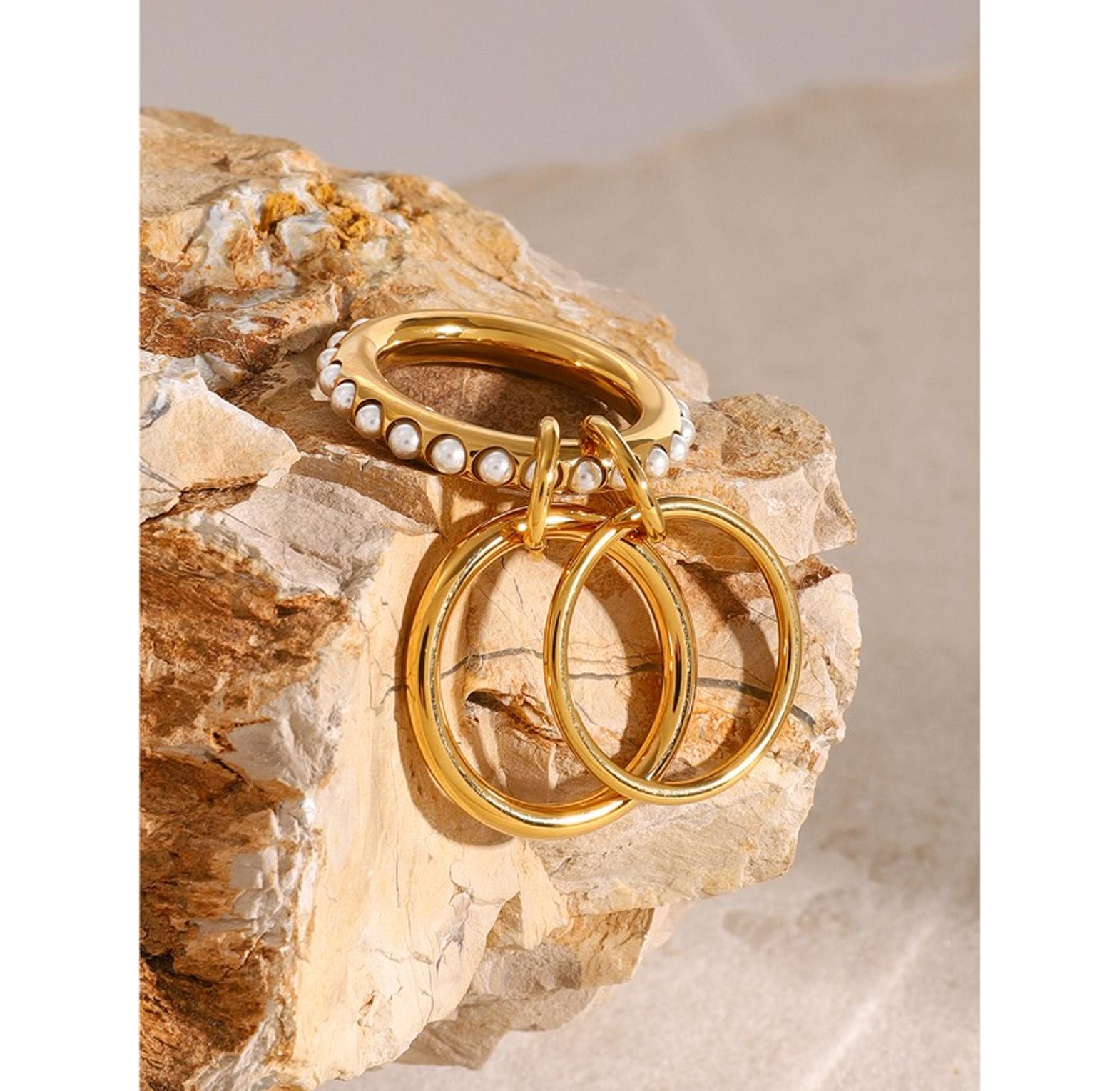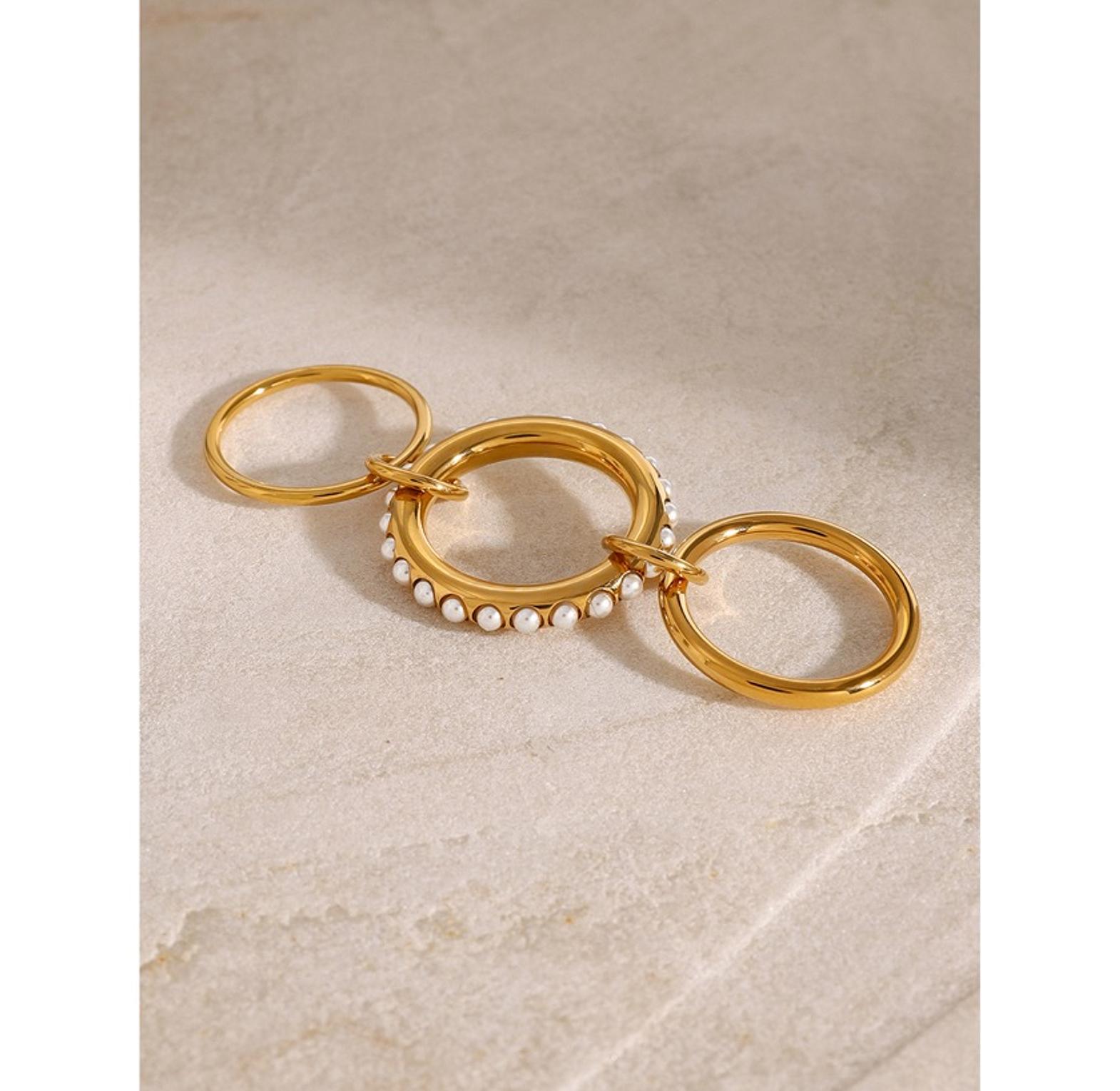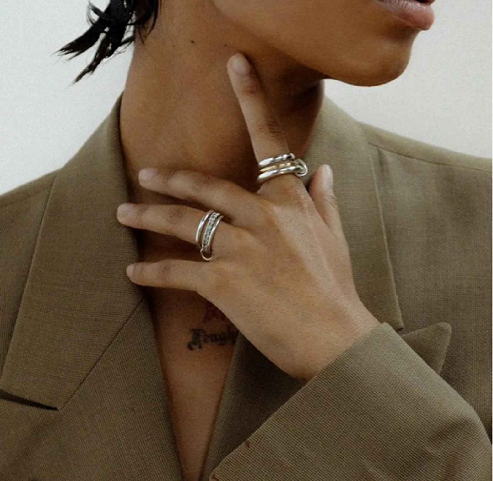 Three interlocked rings in mixed metal tones, symbolizing unity and balance.
