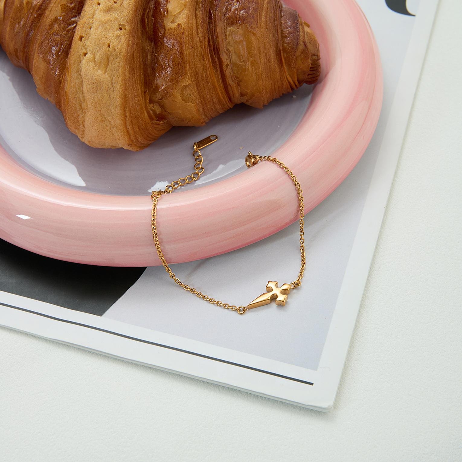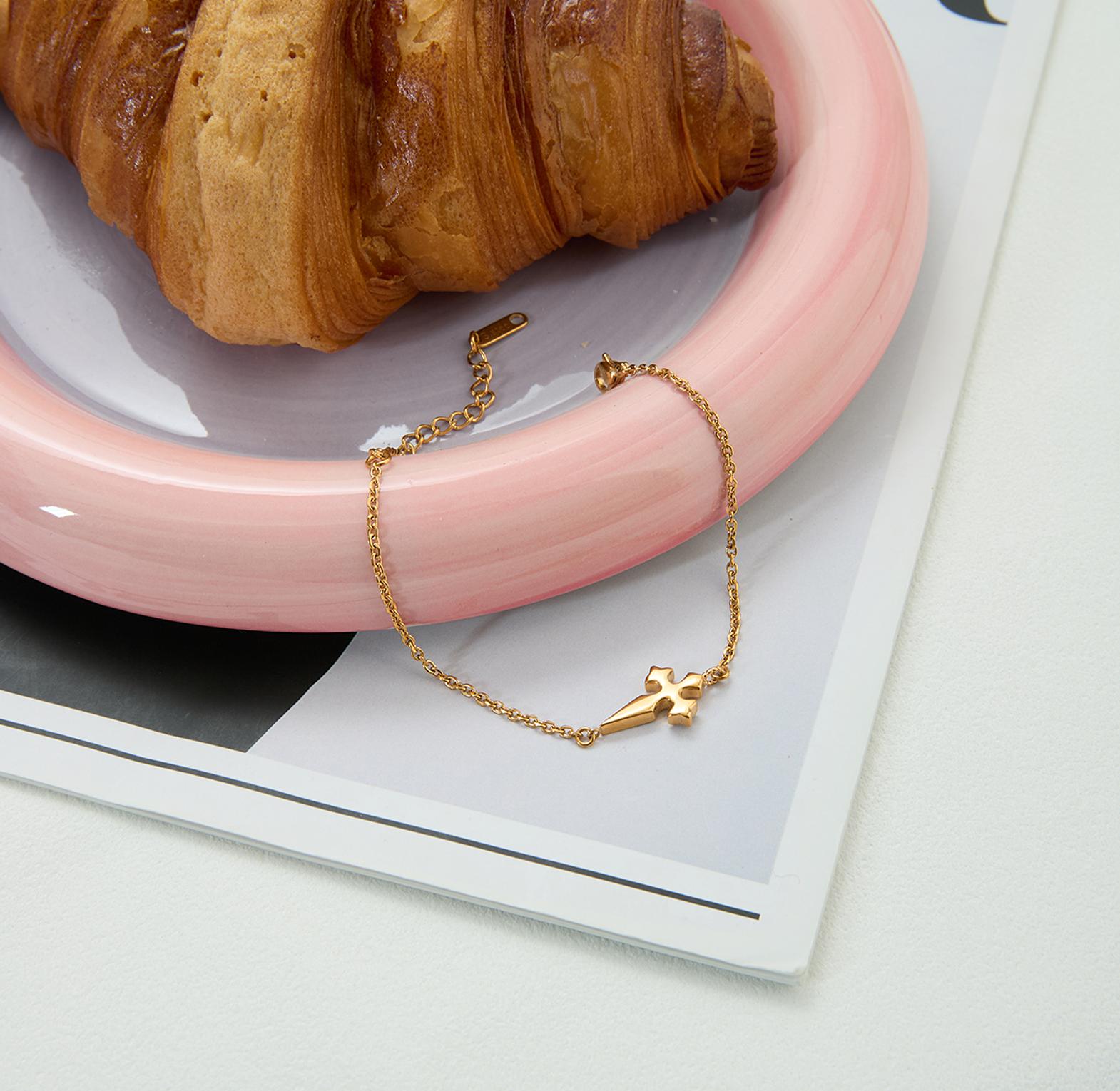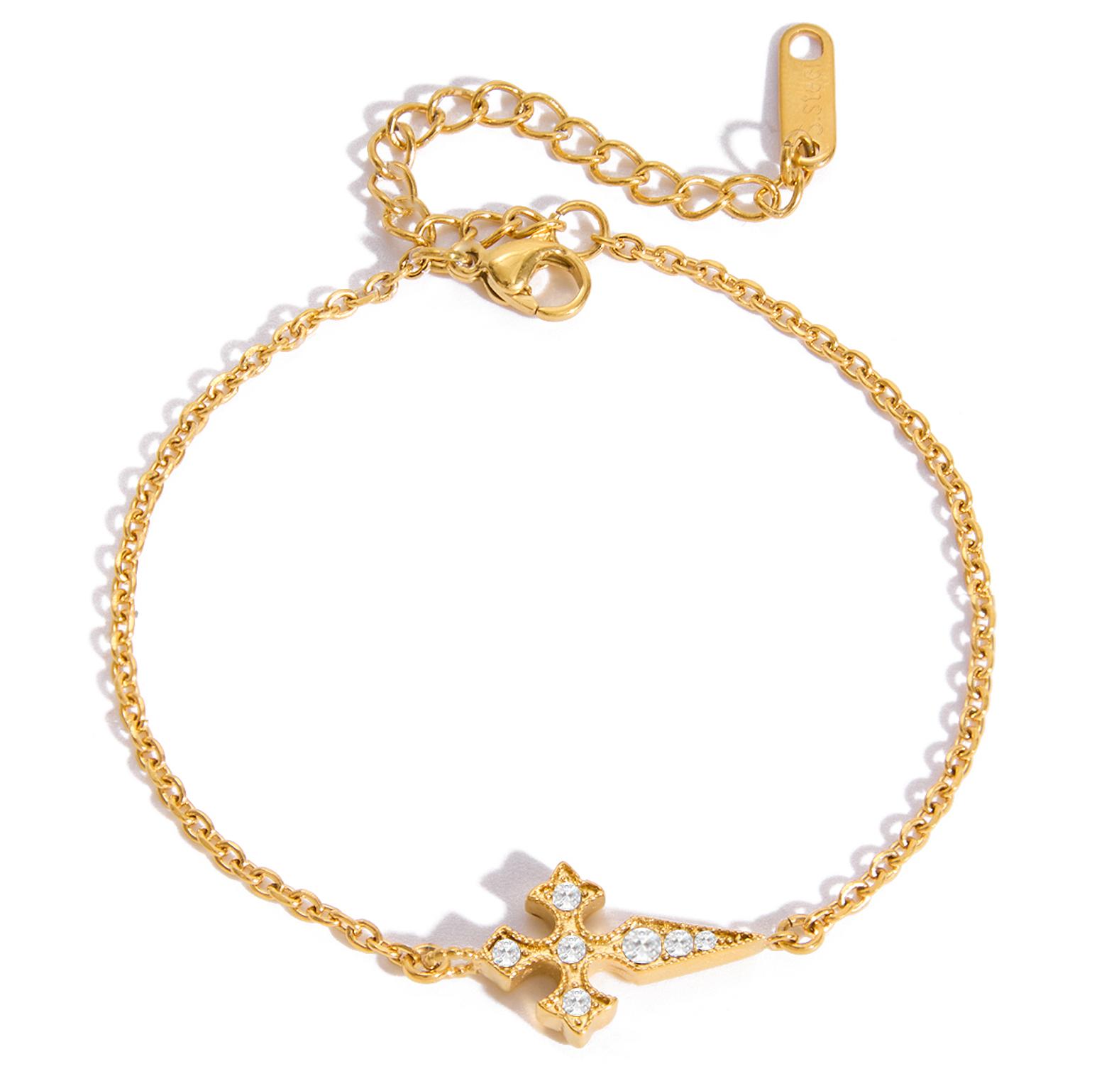 This gold-toned bracelet features a delicate chain and a central cross-shaped pendant embellished with white crystals.