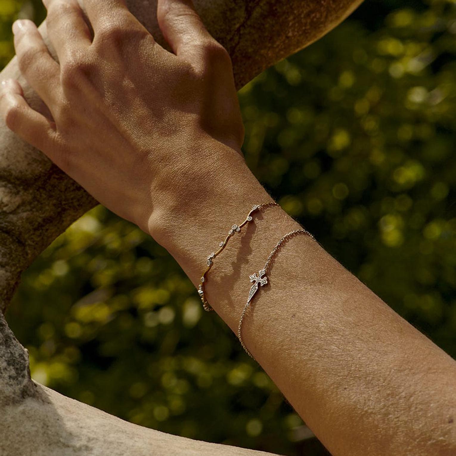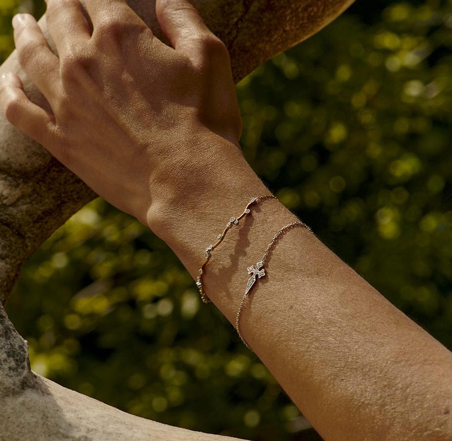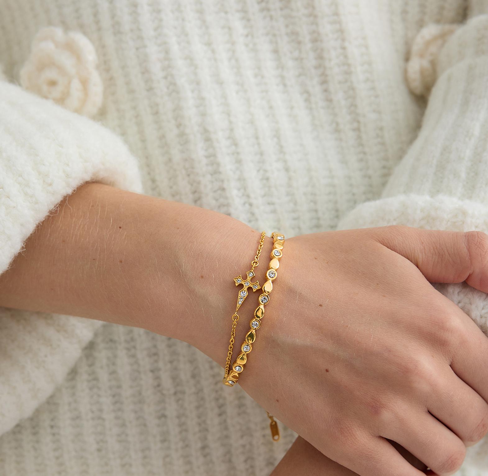This gold-toned bracelet features a delicate chain and a central cross-shaped pendant embellished with white crystals.